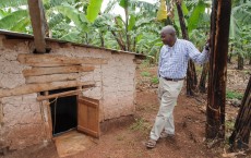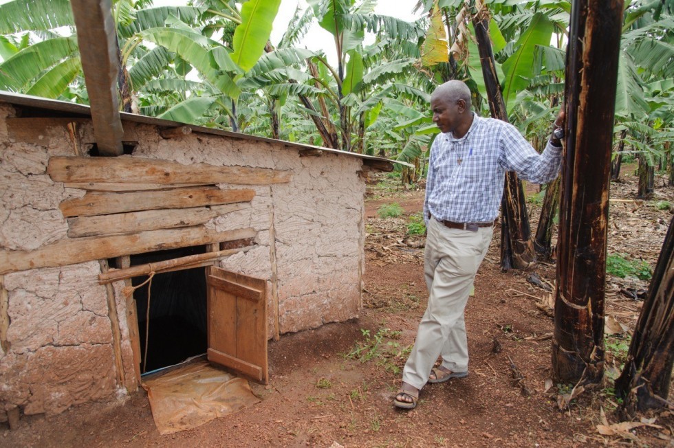 - Father Emmanuel vor der Wassersammelstelle, wo in einem Erdloch Regenwasser gesammelt wird, sodass die Kinder in der Schule etwas zu trinken haben